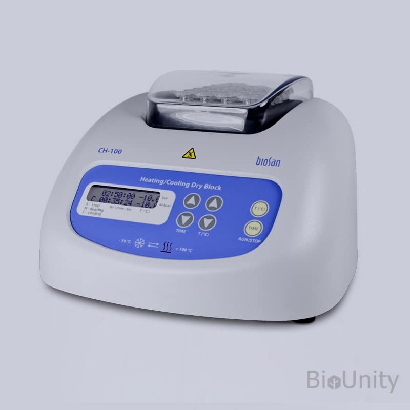 Термостат СН-100 является продуктом комбинирования двух популярных инструментов Биосан: Нагревающего драй–блока; Охлаждающего термостата. Комбинированная конструкция алюминиевого блока для пробирок и модуля элементов Пельтье, охлаждаемого радиатором с принудительной вентиляцией, позволяет добиться быстрой смены режимов охлаждения и нагрева. СН-100 является эффективным инструментом пробоподготовки для постановки ферментативных реакций, для реакций гибридизации, пробоподготовки ДНК.